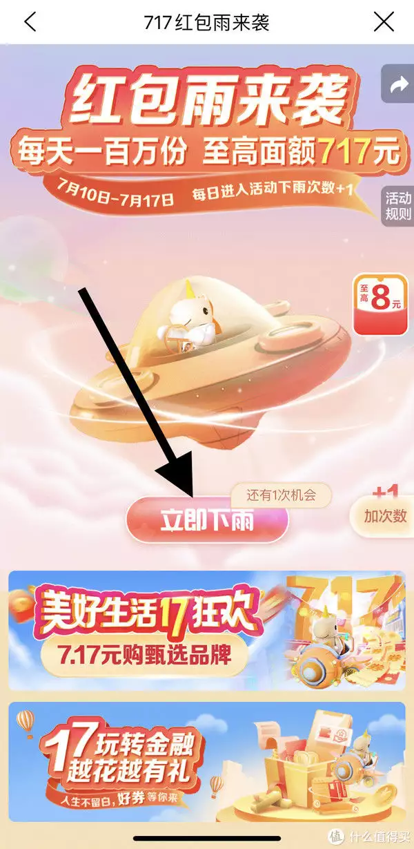 然后进入百万红包雨活动界面后天津办理POS机,点击立即下雨,即可获得随机红包与优惠券!数字人民币地区用户,还可获得暴涨红包机会!截止到2023年7月17日,每天可以去一次领取一次!最高可领取717元红包!