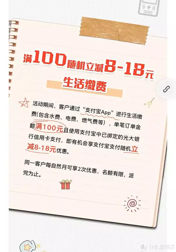 1、每日上午10:0天津POS机申请0使用光大银行信用卡,在支付宝APP进行水、电、燃气费缴费,享满100元随机立减8—18元优惠,同一客户每自然月可享受2次。