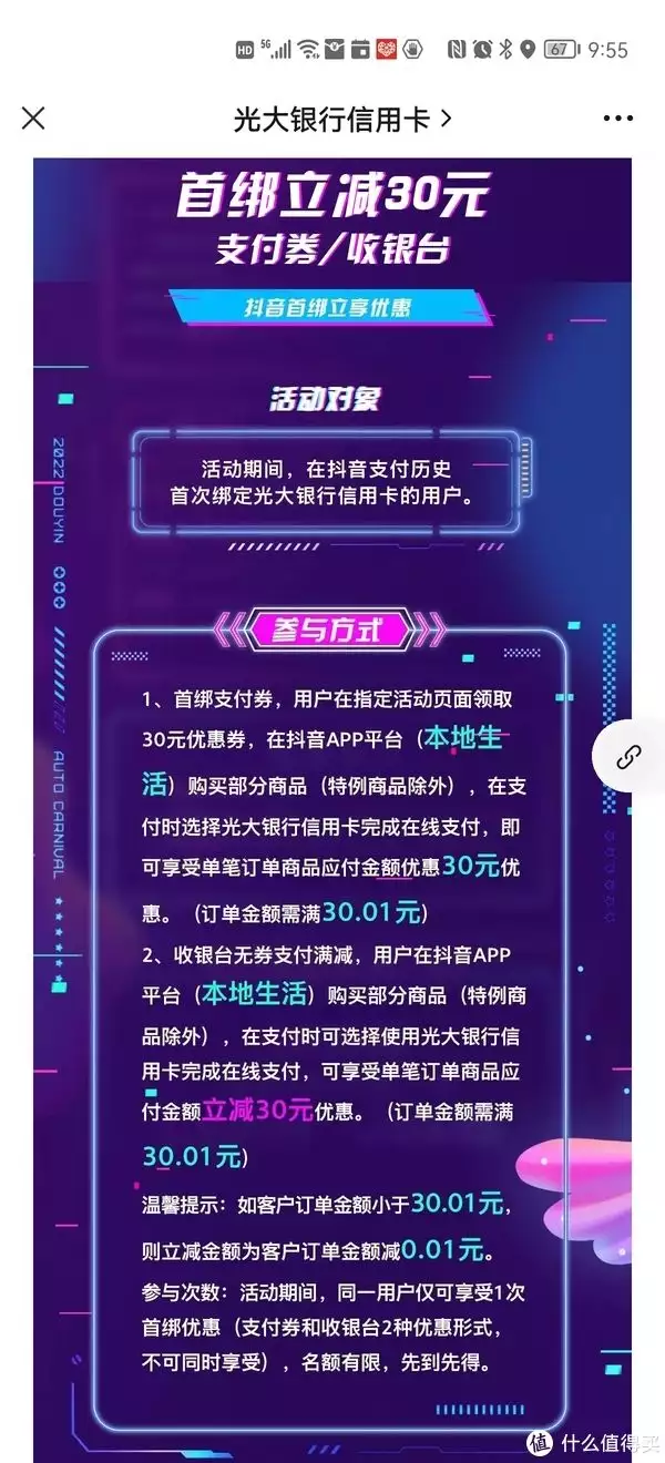另外,在抖音首绑光大信用卡的客户,购买本地生活商品,天津POS机申请可享受单笔订单满30.01减30元,优惠千万别错过。