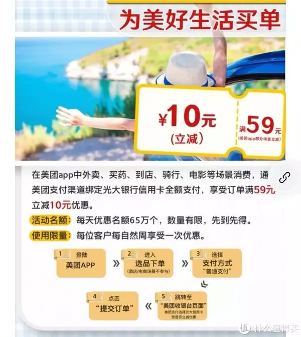 2、在美团APP中外卖、买药、到店、骑行、电信等场景,通过美团支付渠道使用光大银行信用卡消费,订单满59立减10元,天津POS机申请每天优惠名额65万,同一客户每自然周可享受一次。
