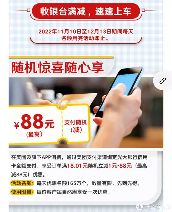 1、使用光大银行信用卡,在美团旗下APP消费,享受满天津POS机申请18.01随机减1-88元优惠,每天优惠名额165万个,同一客户每自然周可享受一次。