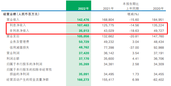 民生银行表示,2022年出现营收下滑,主要是由于利息净收入和非利息净收入出现双降,分别同比大幅下滑14.56%和18.63%。