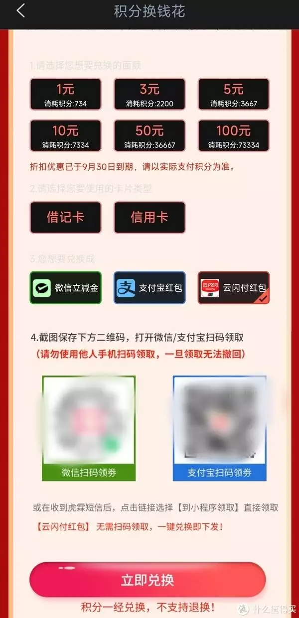 点进去以后就可以看到积分兑换三种类型的红包:云闪付,支付宝,微信立减金。